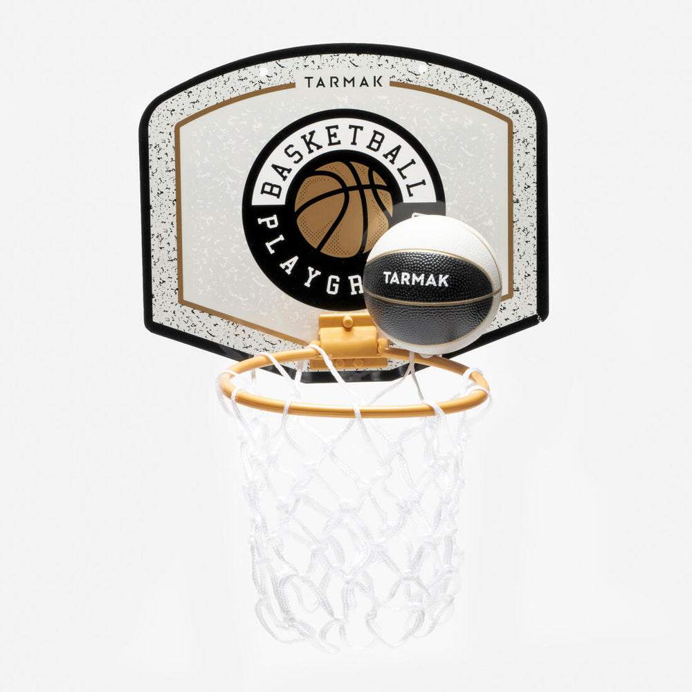 The Mini B Deluxe set by Tarmak is designed for playing indoors. You can stick it (using the adhesive strips on the back of the board) or screw it (2 holes for screws or hooks) onto a wall or door. The rim folds down and comes with a net. It comes with a size 1 mini plastic basketball. Perfect for a kid's bedroom!
